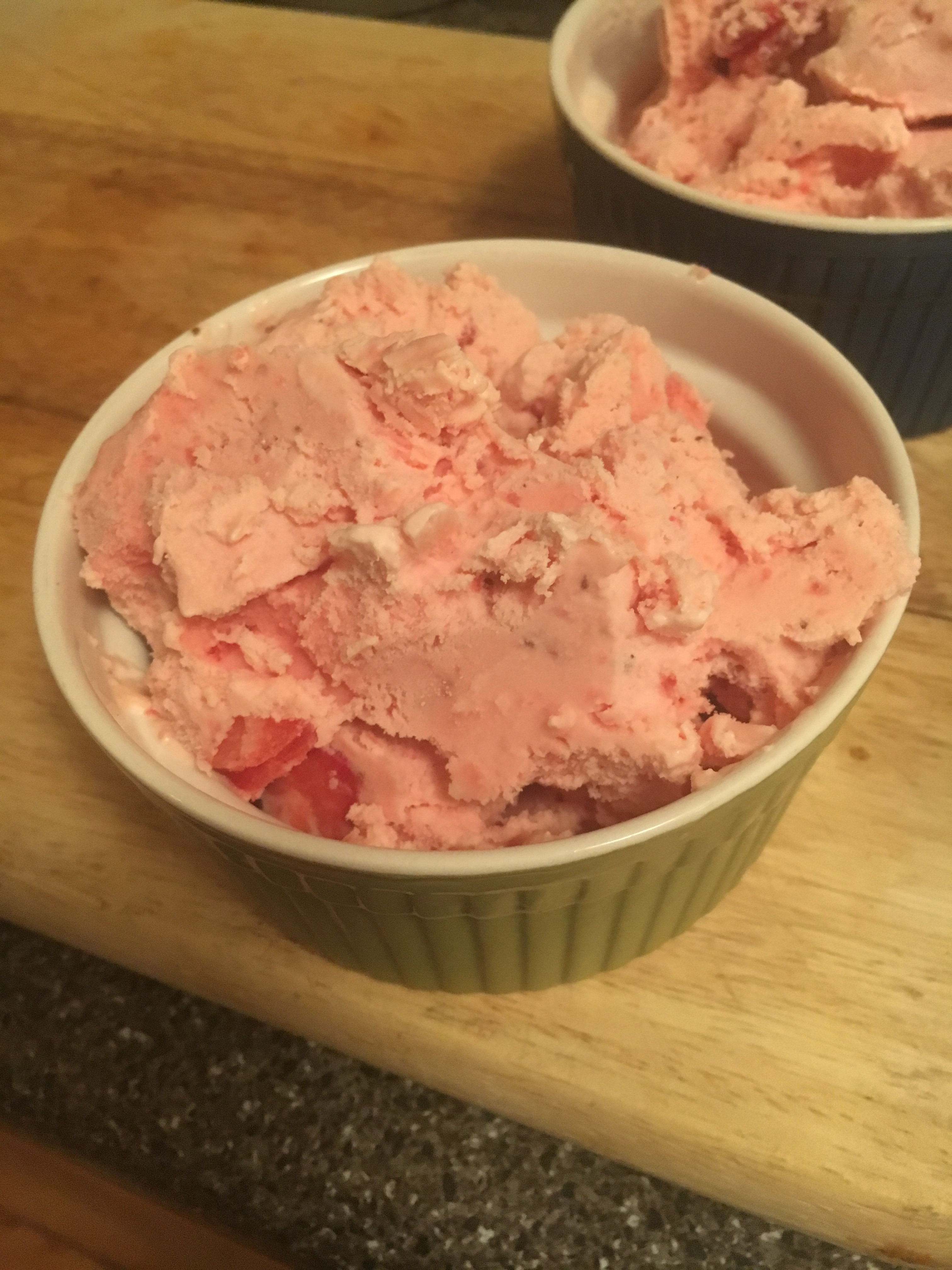 I’ll keep this post as simple as this recipe. I love ice cream. Chocolate is almost always my default, but when I make the time to make my own, I tend to gravitate to whatever fruits are in season. While strawberries are not technically in season right now, I feel like they are more in season now that in, say, November. I went all organic on these ingredients, but I am not convinced that that had any significant effect on the flavor. All I know is that this is easy, delicious, and sure to please. Looking forward to trying this with peaches and other berries before the weather turns frosty and I turn to bread pudding.