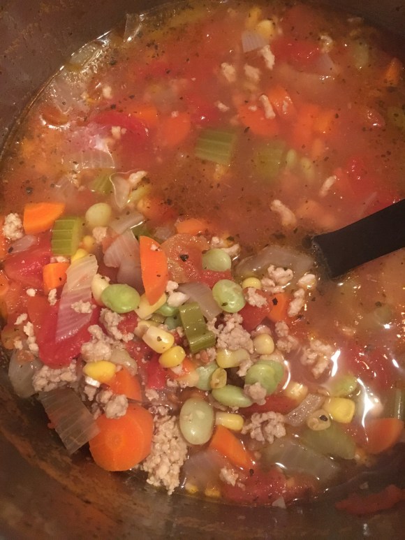 Heat 2-3 TBSPs of olive oil over medium-high heat in a big soup pot until shimmering, but not smoking. Add 1 pound of ground chicken, turkey, or beef and cook/stir until brown an crumbly. Add 1 medium onion, diced; 2 medium carrots, diced; and 3 stalks of celery, diced. Stir to combine, season generously with salt, and saute until vegetables begin to soften. Add freshly ground black pepper to taste, along with any herbs/seasonings you like. Next, add a large can of diced tomatoes, along with all the liquid, and 4+ cups of chicken, beef, or vegetable stock (homemade, if possible); just add enough to bring it up to “soup” consistency. Again, stir to combine and bring to a simmer. At this point, I add fresh or frozen corn and lima beans because that’s what my mom always did, but you can add any vegetables you like. Simmer for about 15 minutes, or longer, if you aren’t in a rush. This is the kind of soup that I tend to let sit out on the stove for awhile to cool after I eat, but I always go back for a second (or third) helping.
