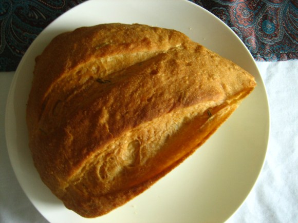 In spite of the fact that I think that Martha Stewart’s recipes are written in a way that sets you up for failure, I like the ideas she presents in her Baking Handbook.*  It is a decidedly complicated, unusable book, but find it inspiring.  Most recently, I made her Olive Oil Bread and, after many adjustments on flour, came out with a very delicious, beautiful product.  When I am making bread, I figure that I should try to make it somehow special, so in this case, I used some very good olive oil and added a healthy tablespoon of chopped fresh rosemary.  Something about the texture of this bread, along with the herbal notes of the rosemary, made it so satisfying and delicious.