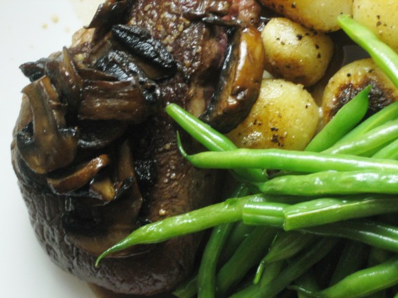 In the end, it came together pretty well. I even made wine pairings, serving Kir Royale with the rillettes, a dry rose with the salad, and a young red with the steak (which I served with boiled potatoes that I sauteed in butter and some simply steamed green beans).