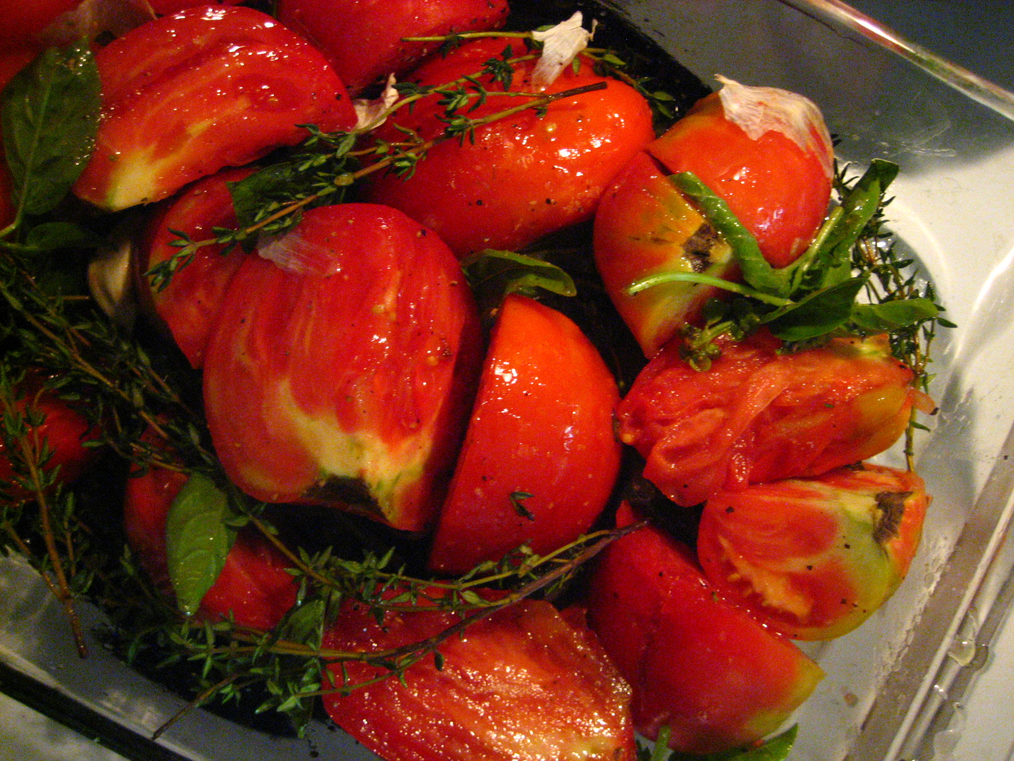 Preheat your oven to 475°.  Find the largest baking sheet you own.  Envision that baking sheet when you go out to your garden or to the local farmers market and get as many tomatoes as you think will fit onto the sheet.  To make a half recipe, you can cut each tomato into halves or quarters to fill the baking sheet (see my pic).  Once you have them situated on the sheet, drizzle with a few tablespoons of olive oil (just enough to give them a sheen) and season with salt and freshly ground black (or white) pepper.  Tuck a few sprigs of thyme, basil, oregano, or tarragon (super summery!)—a combination of herbs works best—in between the tomatoes and scatter 7-10 cloves of skin-on garlic over them, as well.  Place the whole tray into the oven and roast on high for 10-20 minutes, cooking with your nose during this time; if you start to smell burnt tomatoes, turn the oven down before you get to 20 minutes.  You want some roasted flavor, but not a burnt mess.  If the tomatoes can withstand the high heat, then give them a full 20 minutes before you turn the oven to 250º for 45 minutes to an hour.