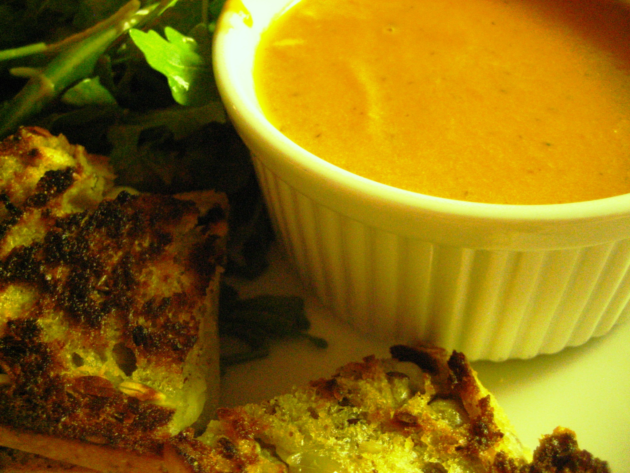 After the slow roasting period, the blender and the mesh strainer come into play, in that order.  Once the tomatoes cool a bit, pull the stems of the herbs out from amongst them, as well as the garlic cloves, which should be soft enough that you can just squeeze the garlic out of the skins and into the blender.  Add the tomatoes to the blender in batches, being careful when pureeing them (they’ll still be quite hot).  I always put the lid on and then hold a clean towel over the top to prevent any accidents.  Blend the garlic, tomatoes, and herbs until they are a smooth puree, then strain them into a soup pot big enough to hold them and still have room for a little more liquid (straining will remove any seeds or skins).  Depending on how “comforting” you want your soup to be, you can add a half to full cup of half and half, light cream, or heavy cream once you bring the puree back to a simmer (the amount of dairy should be just enough to change the color from red to pink).  Stir, taste for seasoning, and ladle into bowls or mugs.  Serve with grilled cheese sandwiches, of course.